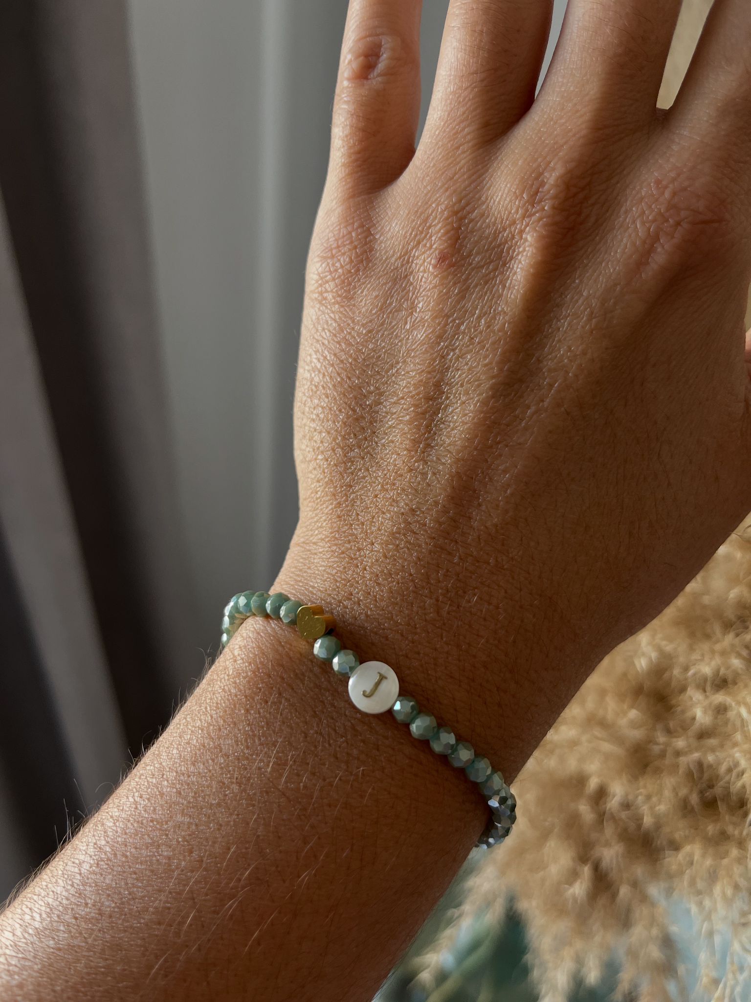 Preciosa pulsera de cristal facetado con un corazón en acero y la inicial en Nácar.